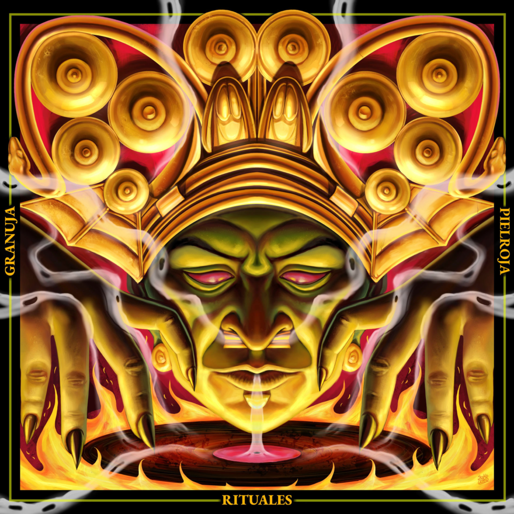 Las connotaciones que Granuja le ha dado a su estilo a lo largo de los años giran en torno a lo nocturno, lo visceral y lo urbano. Las aproximaciones a la espiritualidad no son para nada esperables de su parte, un hombre adulto que no profesa ningún credo y que tiene como uno de sus hits una canción titulada ‘Ateo’. Sin embargo, con “Rituales” nos brinda un abanico de misticismo, en el que lo surreal se entremezcla con los códigos raperos y callejeros más sombríos. Junto a Piel Roja se sumergen en los saberes populares y barriales para contracturar al género y desplazarlo a un imaginario que se sostiene de ánimas, maldiciones, brujería y los terrores propios del centro de tu ciudad a las 3AM. No en vano la portada ilustra la transformación de un chamán tayrona en murciélago.