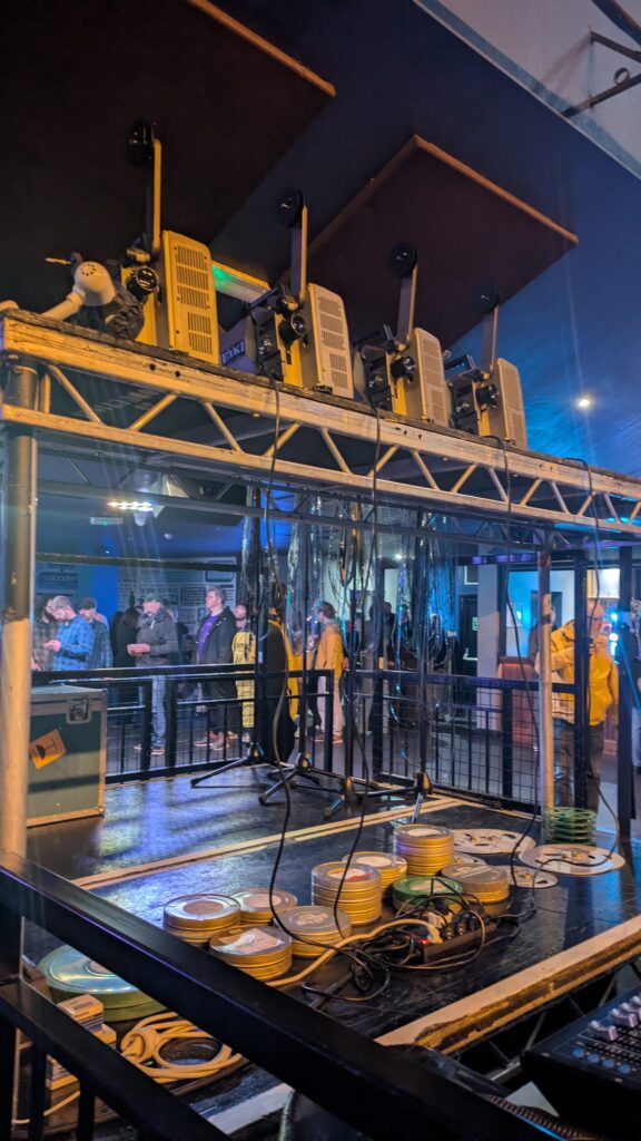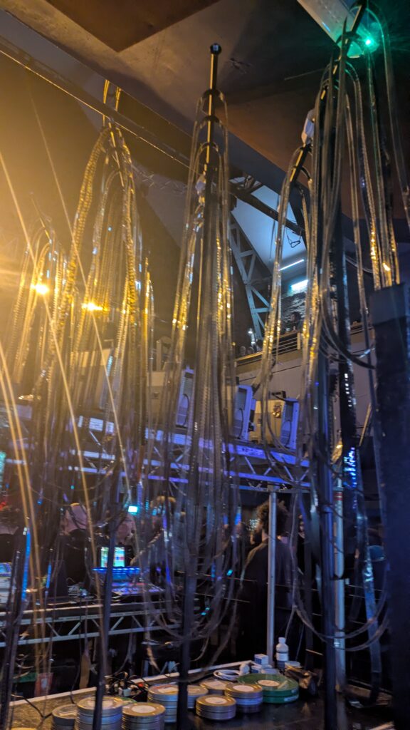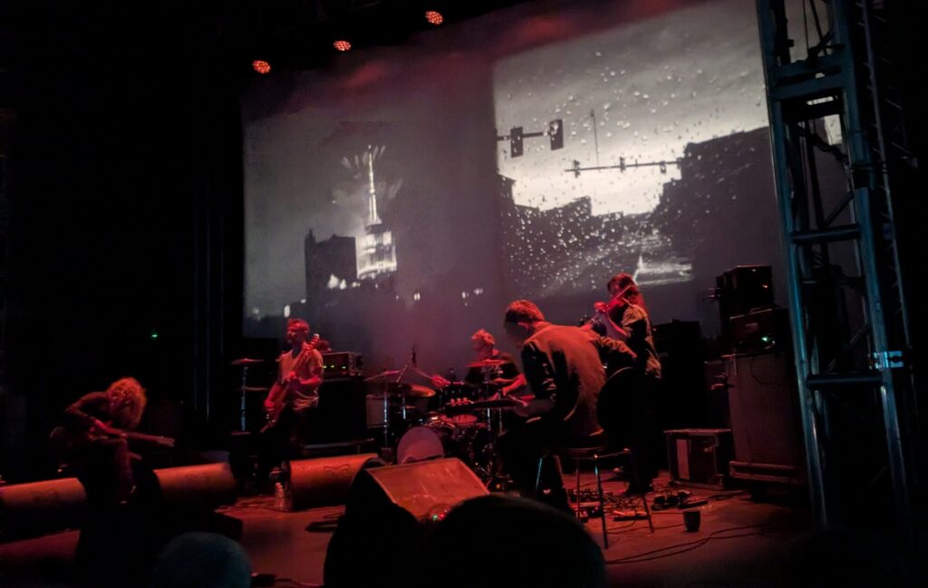 El ruido de los proyectores de 16mm llama la atención de algunas personas, la atención no dura mucho, todos los miembros de GY!BE salen al escenario mientras la palabra esperanza aparece. Las proyecciones muestran un parque de atracciones a muchos fotogramas por minuto, avanzando y retrocediendo, como una máquina que no quiere avanzar, el sonido incrementa o disminuye; pareciera que no se complementa con el metraje que estamos viendo, pero en ciertos momentos encaja. El dolor de cuello asoma, lo ignoro y giro mi cabeza para ver como Karl Lemieux pone su mano delante de los proyectores, sus dedos jugando con la luz emitida. Leo que Lemieux utiliza filmaciones propias, cosas que se encuentra o que algunos miembros de la banda graban. El final de ‘World Police and Friendly Fire‘ incluye fotogramas quemados de la película que estamos viendo. Lemieux quema en vivo este material y, si uno es lo suficientemente valiente, puede pedirle un pedacito. Los crescendos se elevaron aun más con los fotogramas de este metraje quemado; el escenario estaba en llamas.
