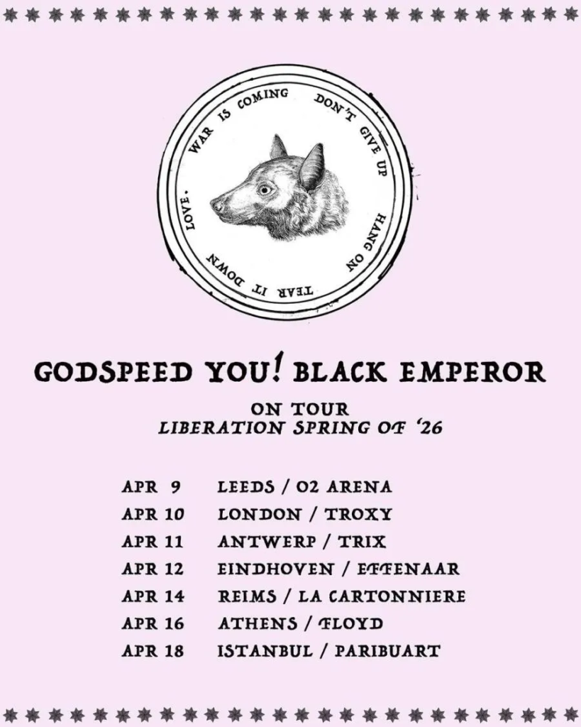Ese concierto de hace dos años, así como al que asistí el 9 de abril de este año, empezó con la palabra esperanza proyectada en la pantalla acompañada de un dron. ¿Hay un mensaje político explícito en el último álbum de Godspeed You!? Hay un mensaje explícito en todos los trabajos de Godspeed You!. El poster de este tour tiene como imagen la cabeza de un murciélago en un fondo rosado. Alrededor del que pareciera sonriente animal están las frases: NO TE RINDAS / DERRÍBENLO / AGUARDA / AMA / LA GUERRA SE ACERCA.